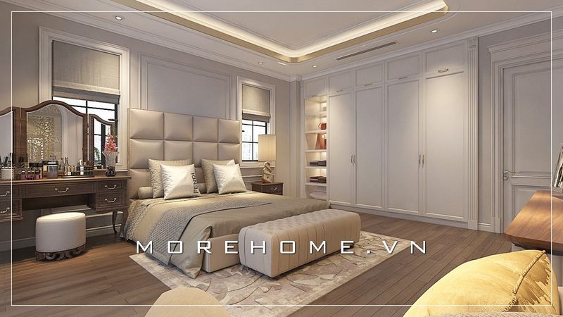 Phòng ngủ của gia chủ trở nên nổi bật với mẫu tủ quần áo âm tường tân cổ điển màu trắng trang nhã, tinh tế giúp tiết kiệm diện tích không gian căn phòng