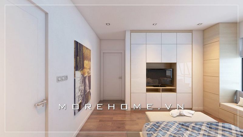 Thiết kế tủ quần áo âm tường màu trắng, gợi cho không gian phòng ngủ thêm rộng và gọn gàng hơn