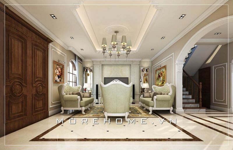 Mẫu thiết kế phòng khách biệt thự đẹp theo phong cách tân cổ điển hoàng gia sang trọng, đẳng cấp