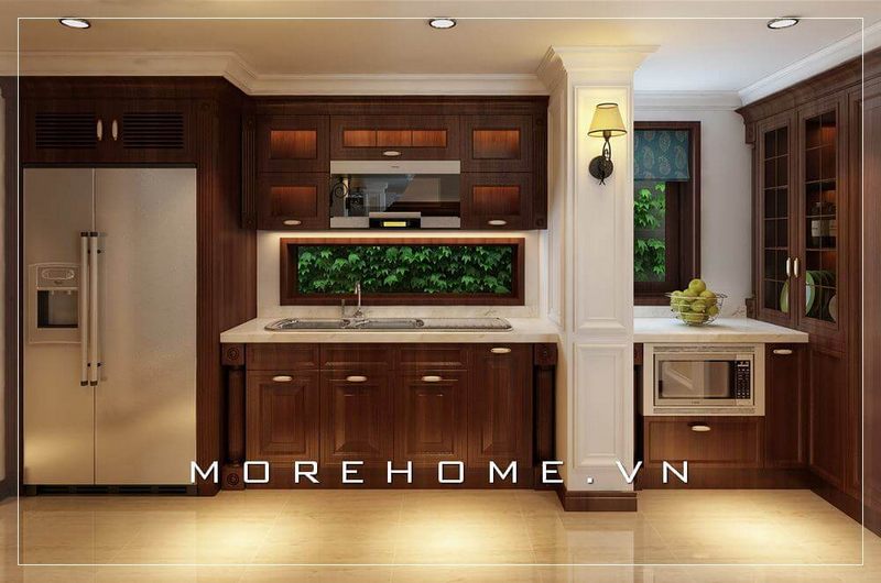 Thiết kế phòng bếp biệt thự tân cổ điển sang trọng với nội thất gỗ tự nhiên tone màu nâu ấm cúng và sang trọng