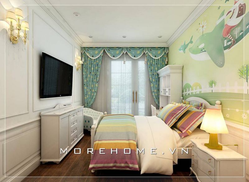 Thiết kế phòng ngủ trẻ em tai biệt thự cao cấp, tranh dán tường đẹp được lựa chọn tạo điểm nhấn cuốn hút cho không gian này