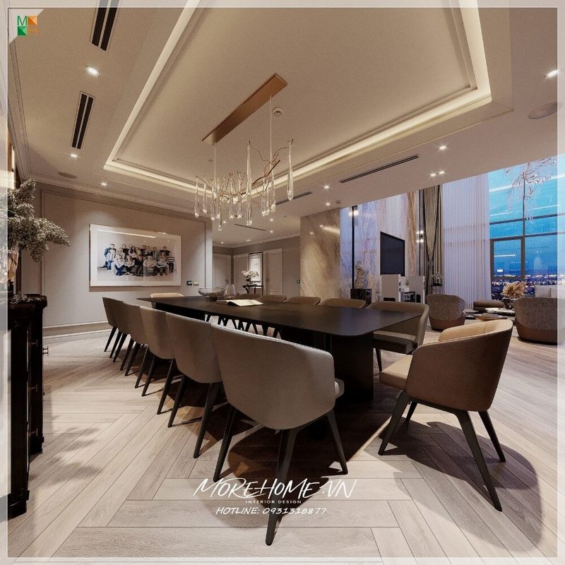 Bàn ghế ăn lớn được đặt trong một không gian rộng lớn của biệt thự, nhà phố là trung tâm của căn phòng hiện đại.