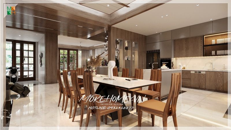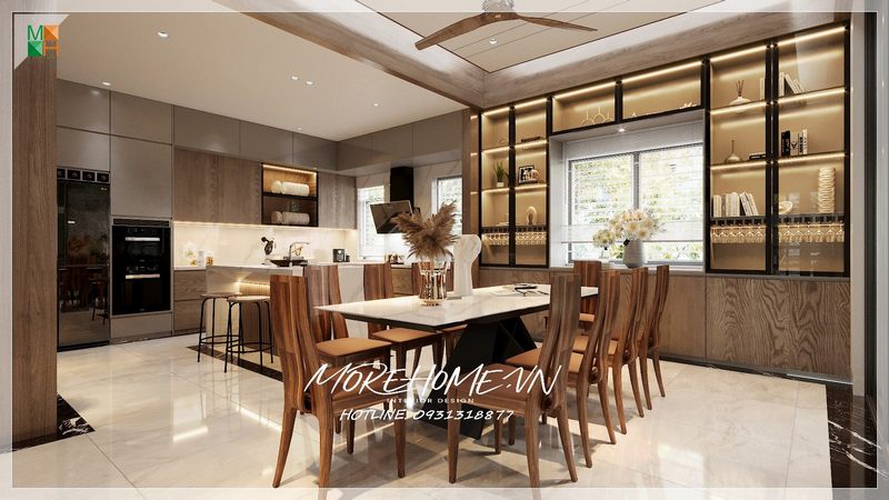 Mẫu tủ bếp gỗ công nghiệp thiết kế full trần kết hợp thiết bị phòng bếp đa năng, hiện đại tạo nên không gian nấu nướng tiện nghi cho người đầu bếp