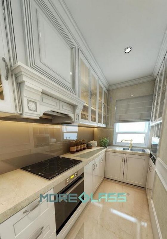 Mẫu kính ốp bếp màu be đậm MG-020 được thiết kế đơn giản để tạo nên một điểm nhấn cho gian bếp có phong cách cổ điển.
